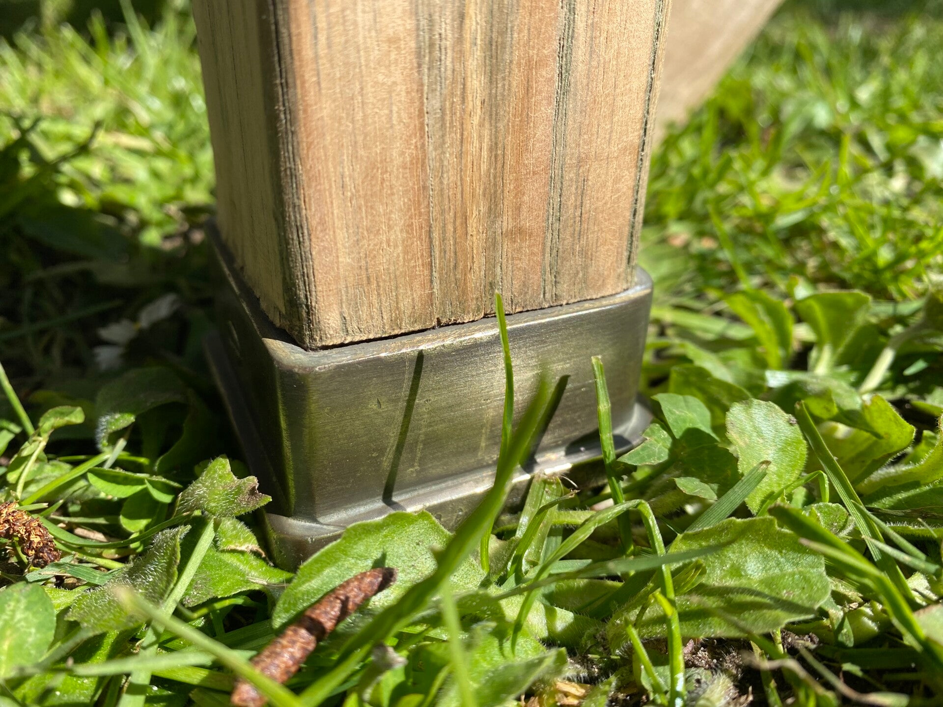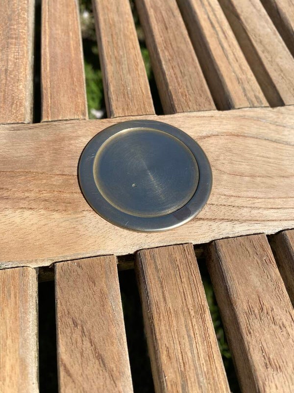 Tuintafel met prachtige messing details. De poten van deze tafel hebben messing tafelpoot beschermers zodat het hout beschermd blijft. Ook de afdekdop van het parasolgat is van messing.